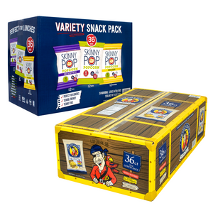 - 36 packs of Skinny Pop snacks in Original, White Cheddar and Salty Kettle flavors for different tastes.