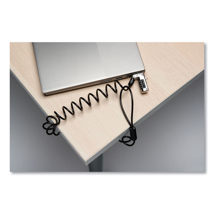 Slim lockhead allows the laptop to lie flat and stable. Won't block valuable ports, allowing for full use of the laptop while attached. Resettable four-wheel number code lets you choose from 10,000 possible combinations. Pivot and rotate cable head featuring one-handed operation allows for easy and flexible connection and movement. Self-coiling carbon steel cable sheathed in plastic stretches up to 6 ft and shrinks down to 76 mm for easy portability. Register & Retrieve™, Kensington®'s free online code registration program allows for quick, secure and easy lookup if the combination is ever lost or forgotten. Kensington® locks are verified and tested. Each lock is precision engineered to meet or exceed rigorous industry standards for strength, physical endurance and mechanical resilience.