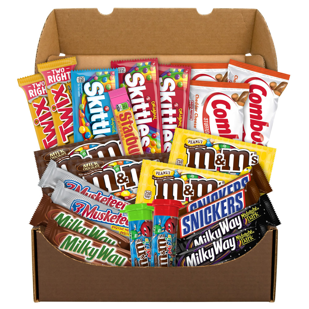 - Combos, Peanut M&M's, Skittles, Starburst, M&M's Minis, Milky Way Dark, Snickers, Twix, M&M's, and 3Musketeers Bar