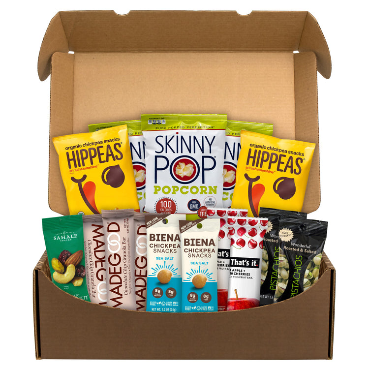 - 2 bags of HIPPEAS Organic Chickpea Puffs Sriracha Sunshine, 2 bags of WONDERFUL Roasted & Salted Pistachios, 3 bags of Skinny Pop 100 Calorie and 2 THAT'S IT Gluten-Free Apple and Cherry Fruit Bars. Also comes with a bag of SAHALE Snacks Classic Fruit & Nut Trail Mix, 3 MADEGOOD Organic Chocolate Chip Granola Bars and 2 bags of BIENA Chickpea Sea Salt Snacks.