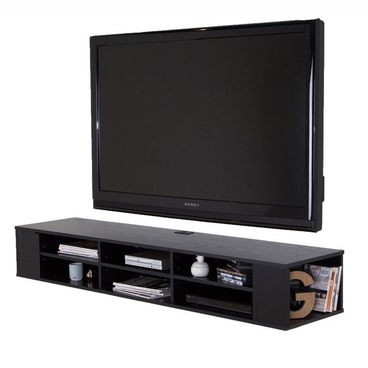 With ample shelving and a stylish look, this console is an easy way to create added storage space for your media. The wall-mounted design allows use in areas with limited floor space.