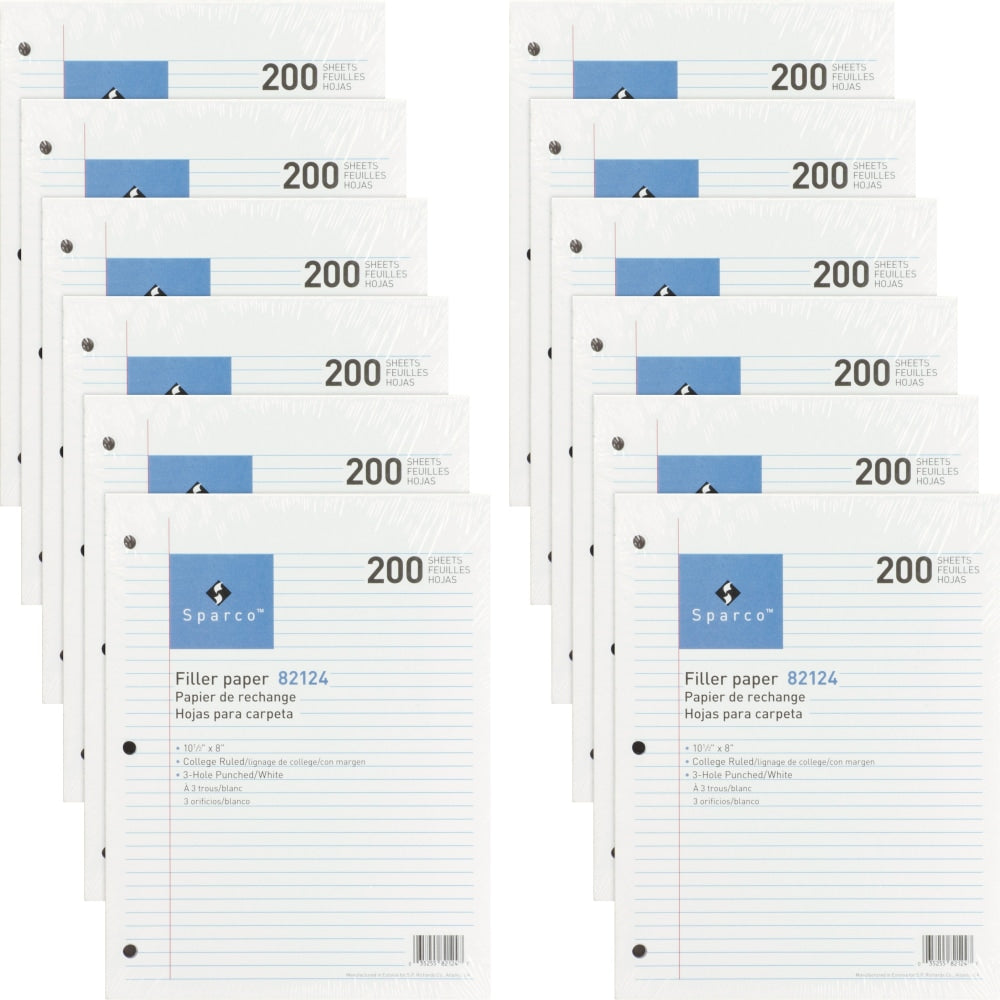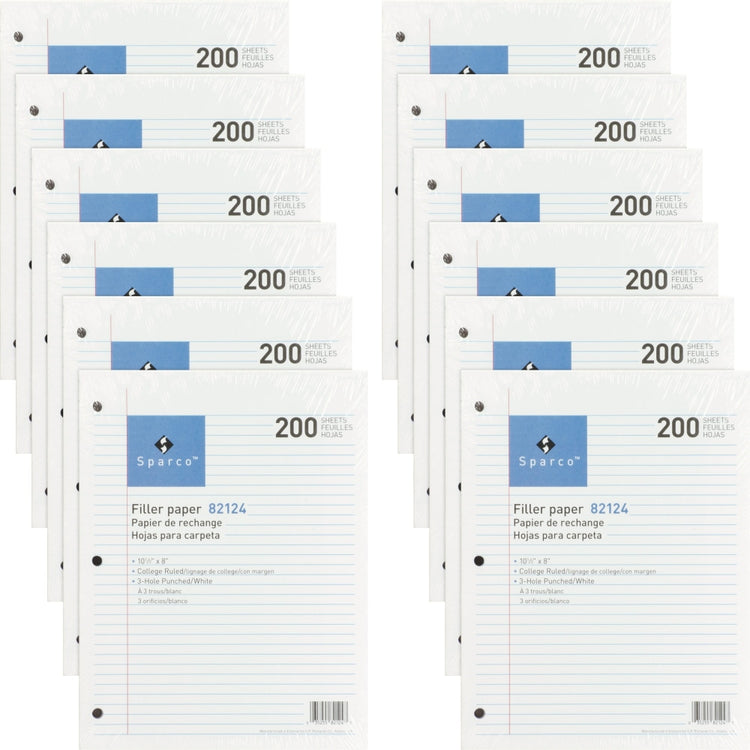 Sparco 3-hole Punched Filler Paper - 2400 Sheets - College Ruled - Ruled Red Margin - 16 lb Basis Weight - 8in x 10 1/2in - White Paper - Bleed-free - 12 / Bundle