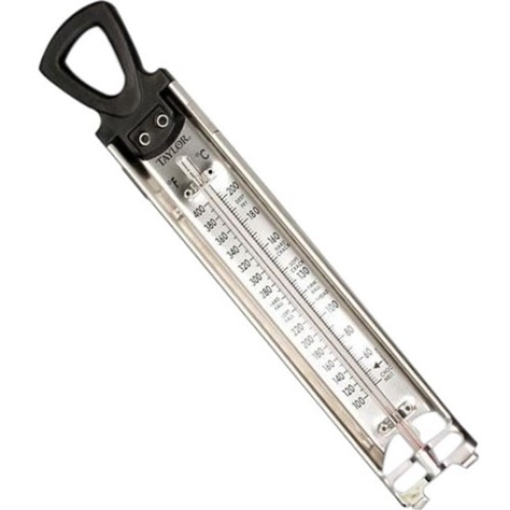 Ensure proper cooking temperatures with this Taylor candy/deep fry thermometer. A classic paddle design and adjustable pan clip support secure attachment to most types of pots and pans, while the oversized stay-cool handle lets you remove this thermometer effortlessly after use. This Taylor candy/deep fry thermometer has easy-to-read numbers and key temperature ranges for quick reference, and the stainless steel construction delivers long-lasting use.
