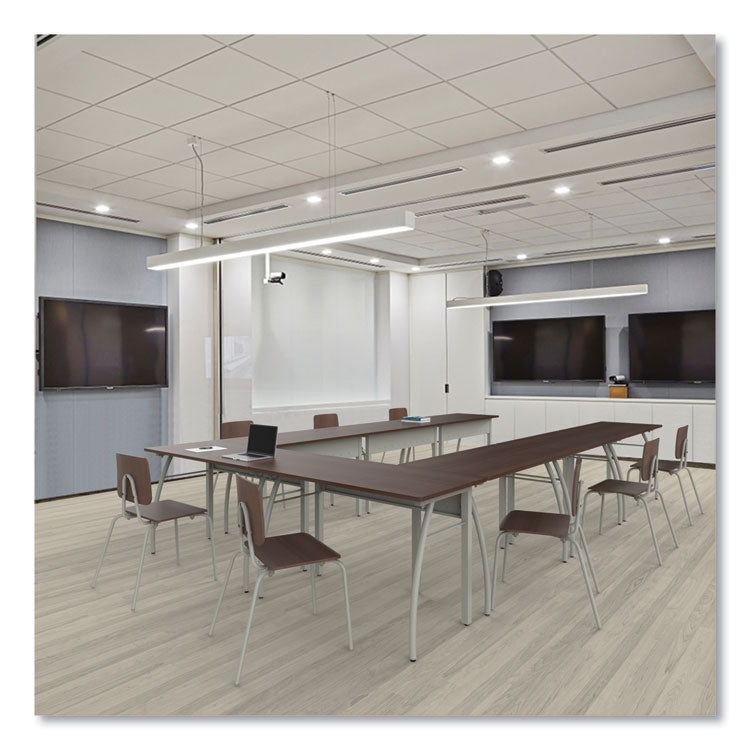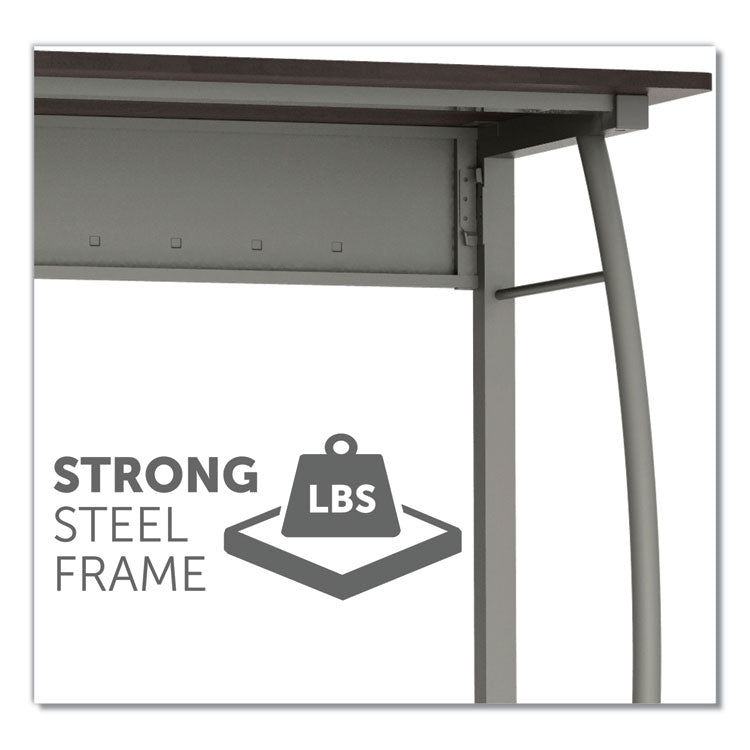 Scratch- and stain-resistant woodgrain laminate with durable edge and strong powder coated steel frame. Adjustable leveling glides for stability. Quick and easy assembly in minutes with no tools required. Configure multiple desks to perfectly fit your space. Includes metal modesty panels. Pedestals fit under desk.