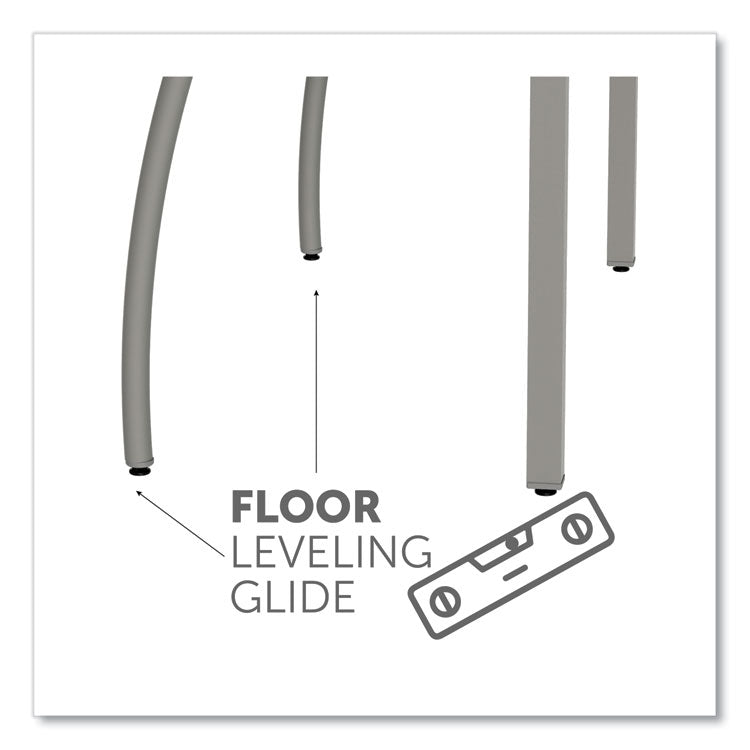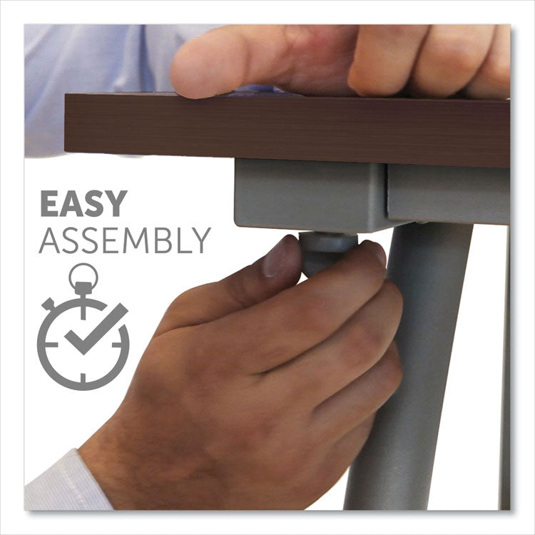Scratch- and stain-resistant woodgrain laminate with durable edge and strong powder coated steel frame. Adjustable leveling glides for stability. Quick and easy assembly in minutes with no tools required. Configure multiple desks to perfectly fit your space. Includes metal modesty panels. Pedestals fit under desk.