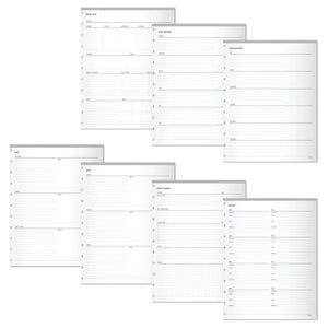 - Inserts include pages for project-planning, yearly overviews, goal-tracking, to-do’s and contacts.