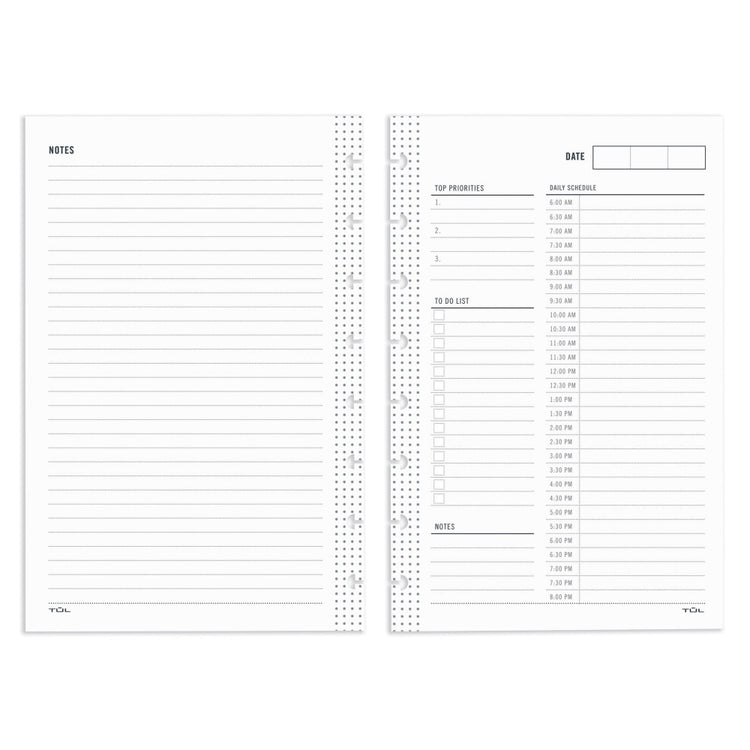 Lay out your plans for each day in your TUL notebook with these refill pages. They're timed and offer areas for lists and priorities, so it's easy to manage your schedule.