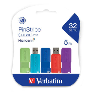 Verbatim PinStripe USB 2.0 Flash Drives, 32GB, Assorted Colors, 5 Pack