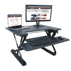 Transition from sitting to standing and back again throughout your workday with this standing desk. With a simple squeeze of the lever handles, you can raise or lower the desk via the gas-spring system, so you can vary your day. The desk features wood construction and a steel frame for rugged durability.