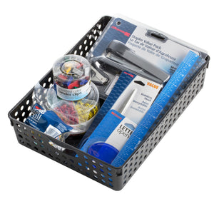 - Includes a storage basket, file basket, full-strip stapler, 1,250 staples, staple remover, 450 colorful paper clips, 30 assorted binder clips, a rubber band ball, 7” straight scissors and an easy-read ruler.