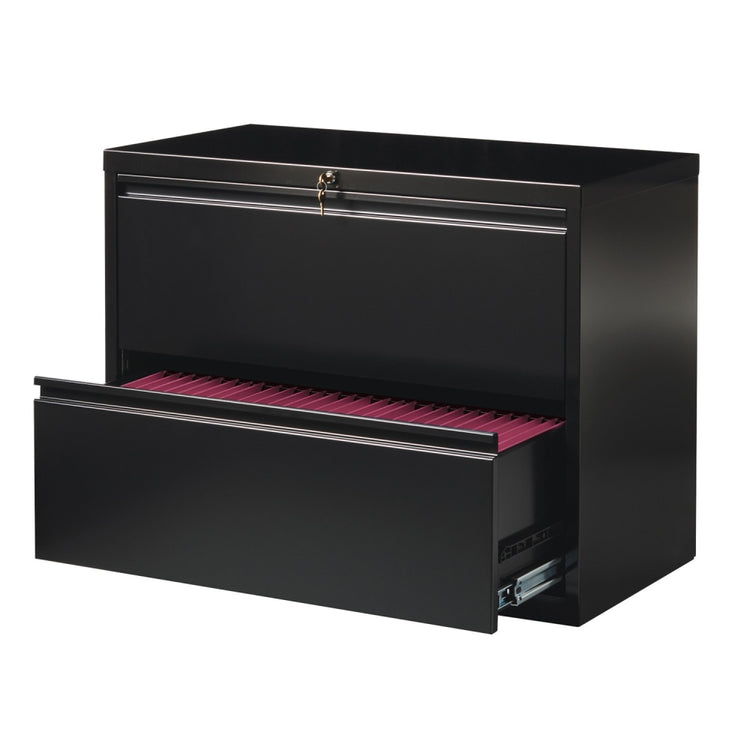 - Sleek WorkPro 36" 2-drawer steel file cabinet in black.