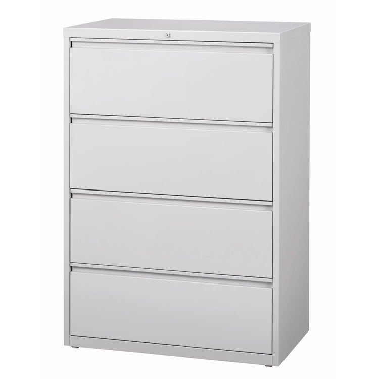 - 4-drawer steel lateral file cabinet includes hang rails.
