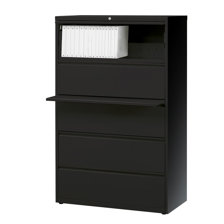 - Contemporary WorkPro 36" 5-drawer steel file cabinet in black.