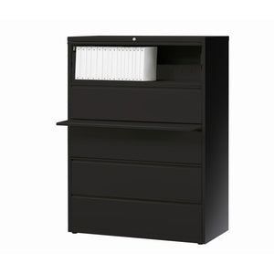 - Modern WorkPro 42" 5-drawer steel lateral file cabinet in black.